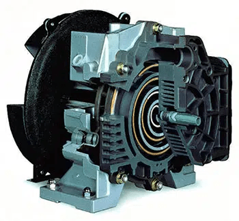 A scroll compressor is a type of (usually) oil-free orbiting displacement compressor, i.e. it compresses a specific amount of air into a continuously decreasing volume. The compressor element consists of a stator spiral fixed in a housing and a motor-driven eccentric, orbiting spiral. The compression cycle is in progress for 2.5 turns, which virtually gives constant and pulsation-free air flow. The process is relatively silent and vibration-free, as the element has hardly any torque variation as compared to a piston compressor,