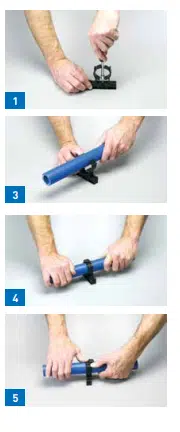 - Press the pipe down into the clip so the 2 arms self-lock around the pipe. Adjust the tightness of the ratchet grip.